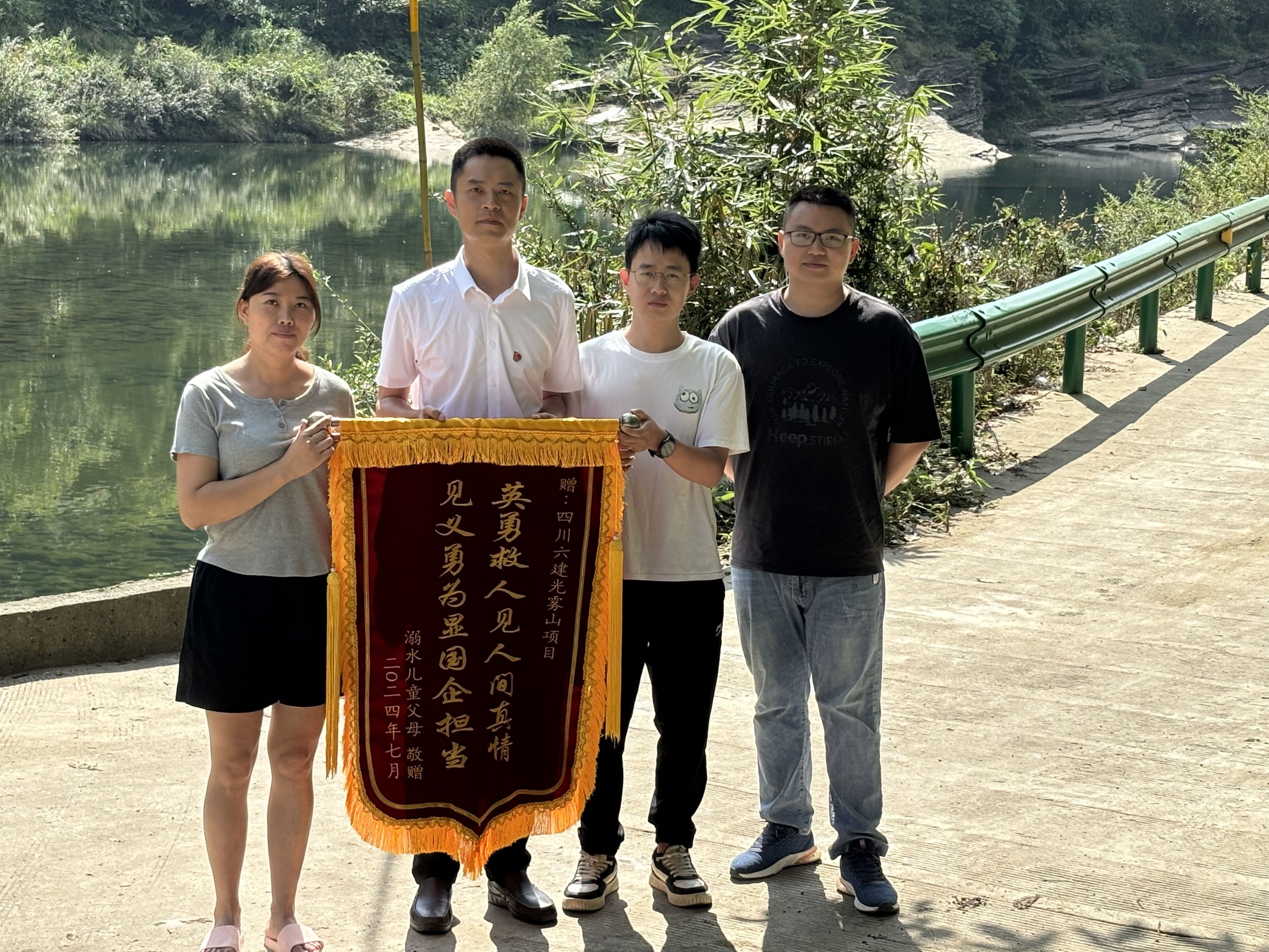 7月28日,位于光霧山旅游景區基礎設施建設項目部附近的光霧山鎮白頭灘村一處漫水橋面一名兒童不慎落水,值此路過的項目管理員王小茜、羅文、唐昆三人見狀挺身而出,合力救起了溺水兒童。幾天后,孩子家長為項目部送來了“英勇救人見人間真情 見義勇為顯國企擔當”錦旗。