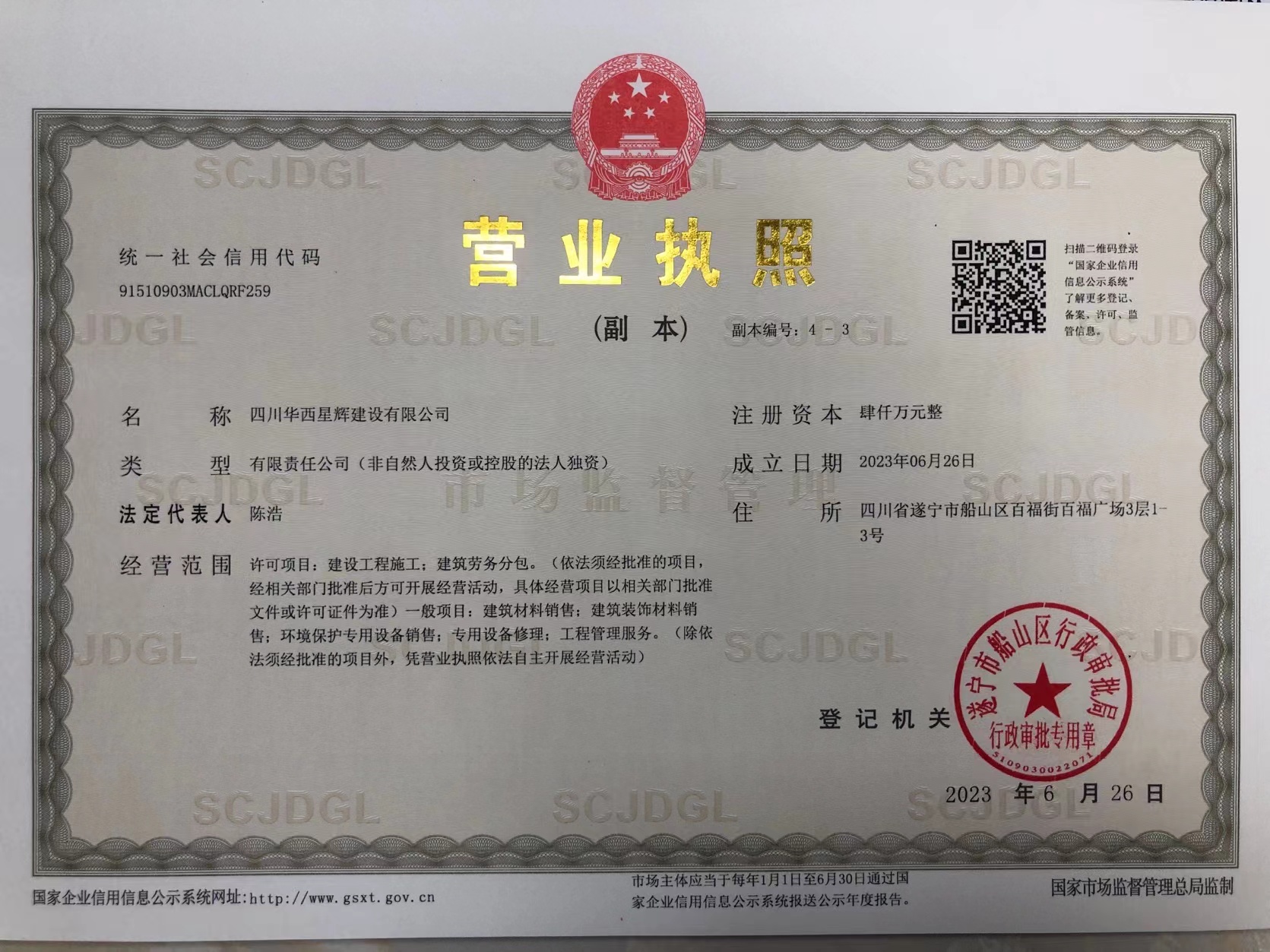 為進一步拓展遂寧及周邊市場、優(yōu)化區(qū)域布局,積極響應地方政府關(guān)于規(guī)范屬地化管理的要求,統(tǒng)籌管理公司在遂項目。6月26日,在集團的關(guān)心和大力支持下,四川六建在遂全資子公司——四川華西星輝建設有限公司順利完成工商注冊。