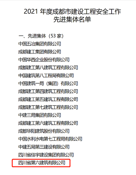 近日,成都市住建局公布了榮獲2021年度成都市建設(shè)工程安全工作先進(jìn)集體的名單,四川六建從眾多建筑企業(yè)中脫穎而出,榮獲“2021年度成都市建設(shè)工程安全工作先進(jìn)集體”稱號。