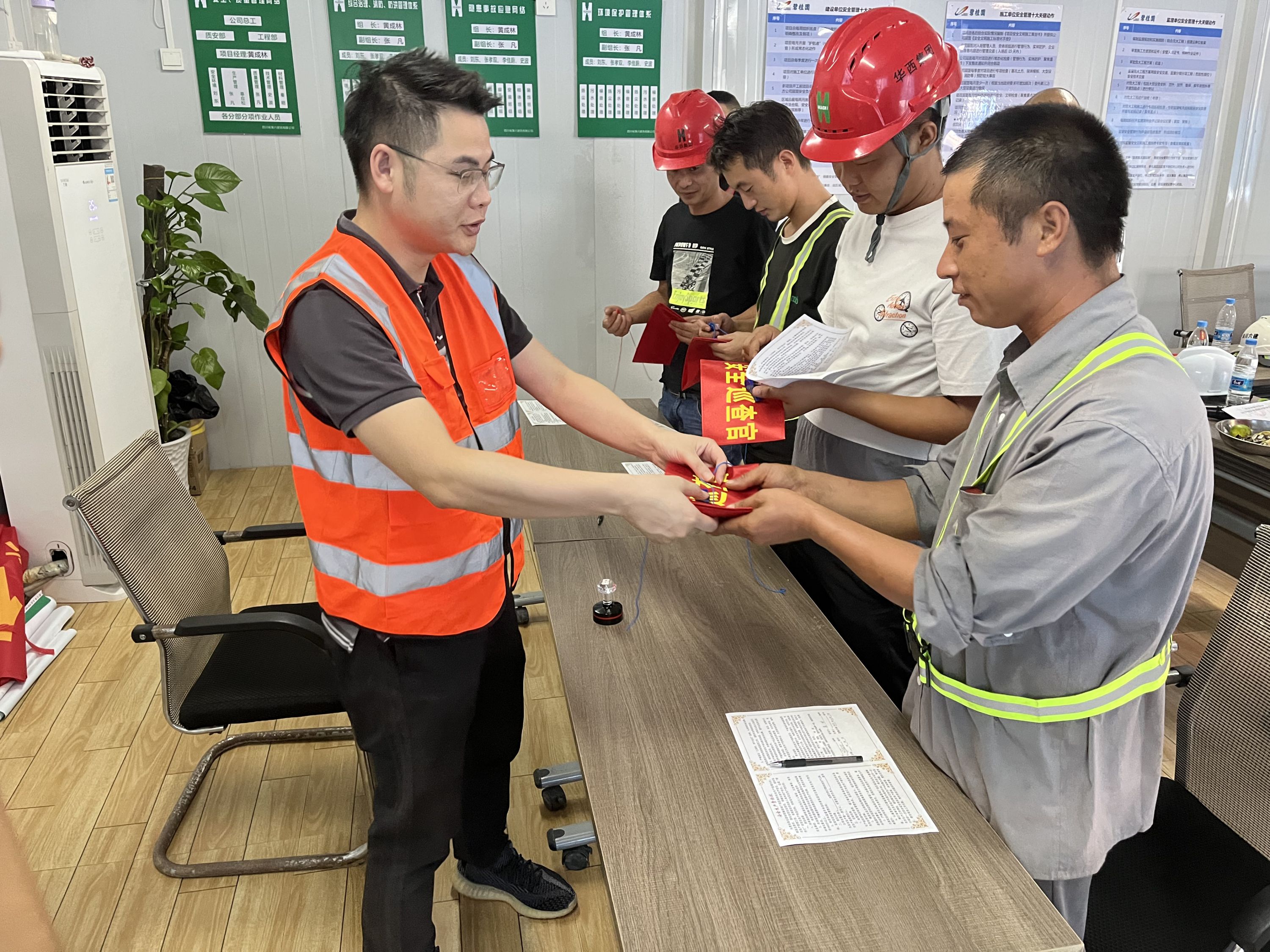 會議學(xué)習(xí)了《安全生產(chǎn)法》,觀看了案例視頻,甲方,總包,工友三方交流了想法,工友們積極發(fā)言表達了各個班組立場的建議,讓以后的安全生產(chǎn)管理工作有了更明確的方向和重點。會上項目部對在安全生產(chǎn)月中表現(xiàn)突出、工作積極的三名同事進行了表揚和嘉獎。同時,各班組表現(xiàn)優(yōu)秀的工友進行了加入安全志愿官的宣誓,并和甲方簽訂了《安全生產(chǎn)責(zé)任狀》。最后開展慰問工人家屬活動,通過視頻方式跟工人家屬進行了交流,對家屬在家照顧家的辛苦予以了感謝,也希望家屬們能給予更多的關(guān)心和支持,因為親友的寄語是最好的宣貫,是最好的關(guān)懷。