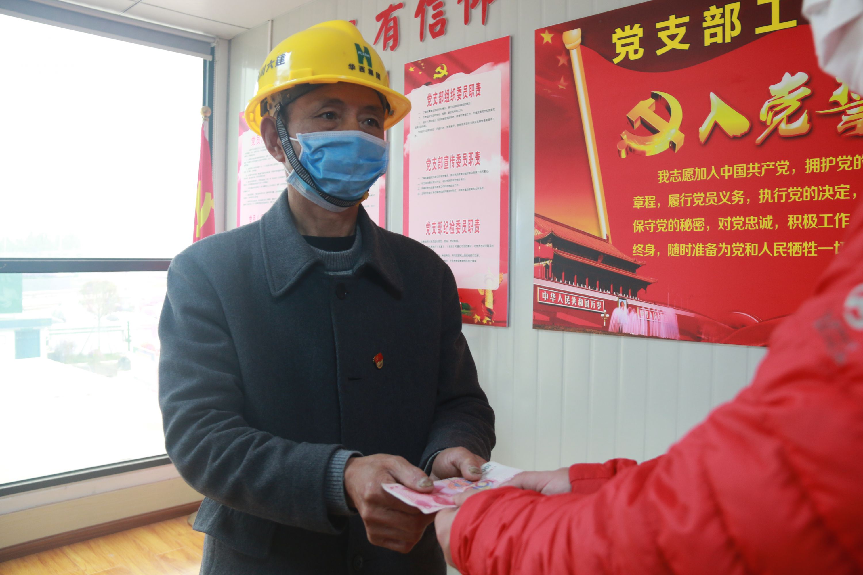 “這是我們的心意,請組織收下!代我們轉交武漢!”3月5日,在公司四川航空維修基地及辦公樓項目部,來自達州的砼工師傅任永明向項目書記遞上了一份自己對黨組織的一份“心意”。“我們雖然不能在‘疫情’一線出力,但是請組織放心,在項目工作上我們絕不‘拉稀擺帶’!同時,我也是一名共產黨員,這是我的一點綿薄之力,國家有難,希望組織能幫我轉交武漢。”來自內江的磚工師傅唐定才和鋼筋工姚平,眼神堅定的望著項目支部書記,同樣請求他將自己的一片心意轉交。據悉,自公司川航項目開工以來,三名黨員同志就一直奮戰在項目施工一線,在施工現場貢獻自己的力量。接到復工通知后,三名黨員同志第一時間辦理完手續后回到項目部參與建設工作。回到項目后,聽聞了黨組織號召黨員捐款的消息,三名黨員同志自發的向項目黨支部遞上了自己的“心意”。
