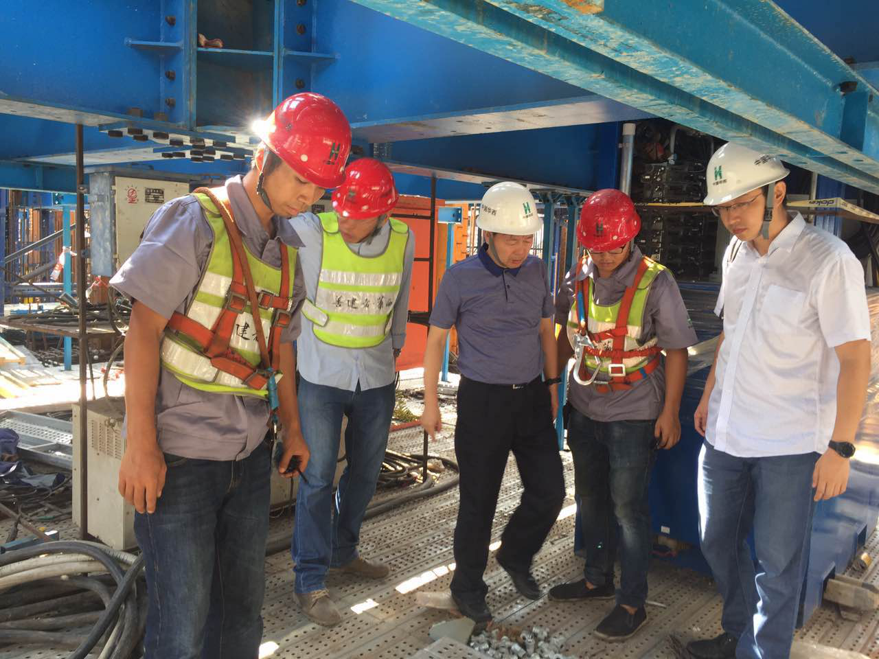 在詳細了解了項目的工程概況、現階段進展以及后續工作安排后,調研小組還仔細查看了模架鋼平臺頂升油缸、控制柜等關鍵部件的安裝質量,并對現場工藝流程、技術難點給予了指導。指導的同時,公司黨委書記、董事長任予鋒對項目部在施工期間積極面對各種困難與挑戰時所表現出來的積極向上、敬業耐勞的工作作風表示了充分的肯定。