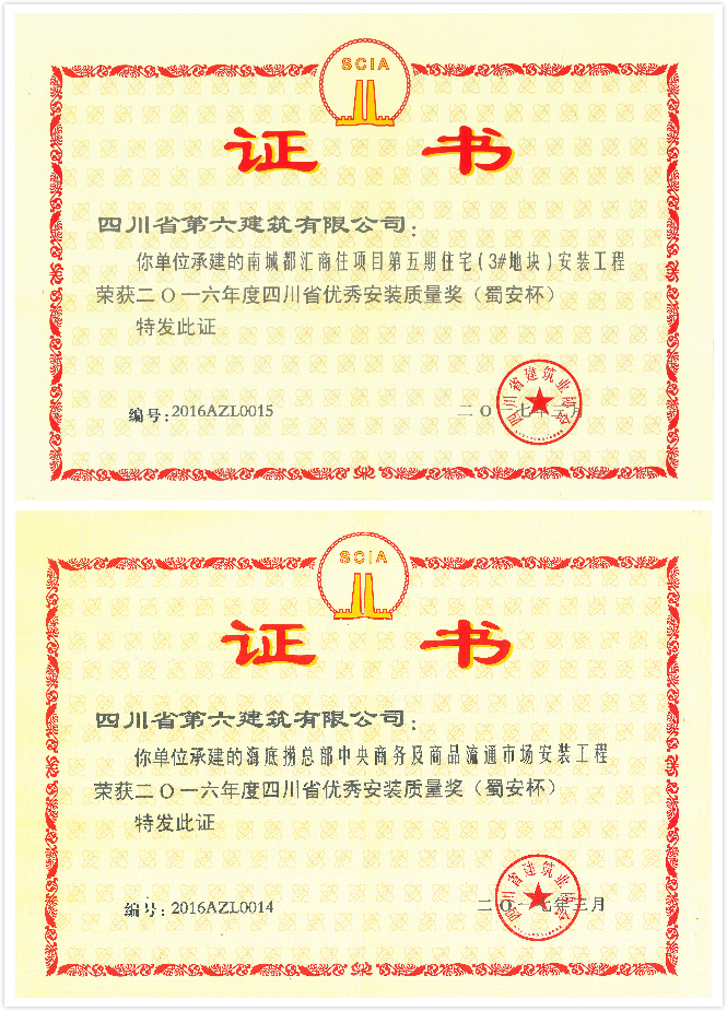近日,由公司承建的南城都匯商住項目第五期住宅(地塊3#)安裝工程及海底撈總部中央商務及商品流通市場項目安裝工程,經主管部門初評、復查、評審、公示后,分別榮獲2016年度四川省優秀安裝質量獎。