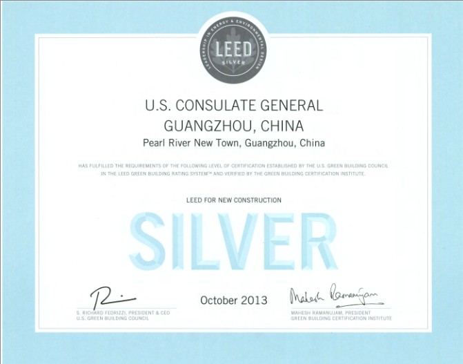 以下是廣州美領(lǐng)館網(wǎng)站對(duì)新館介紹中提及的LEED銀獎(jiǎng)?wù)J證